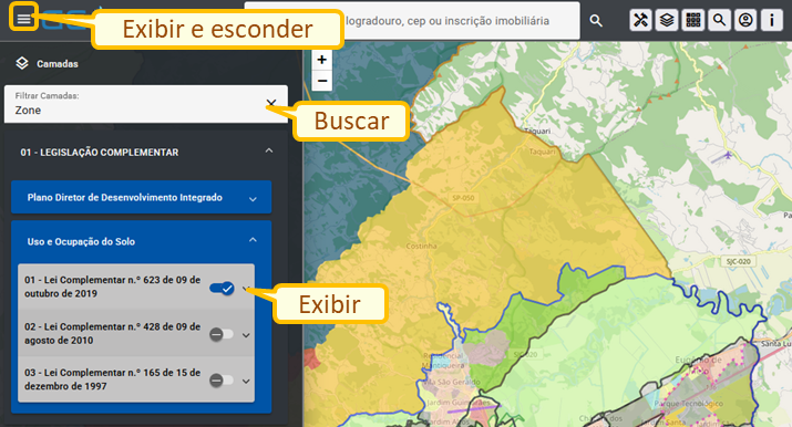 As camadas são conjuntos de dados espaciais exibidos no mapa, por exemplo, Lei Complementar n°623 de 2019 (Lei de Zoneamento). No canto esquerdo da barra superior do Geosanja, existe um botão para exibir e esconder a lista de camadas. Exiba a lista de camadas, localize e/ou filtre a camada desejada. Clique no ícone a direita do nome para ativar a exibição no mapa.Atenção: o uso de muitas camadas ao mesmo tempo vai poluir a imagem e pode dificultar a interpretação dos dados.