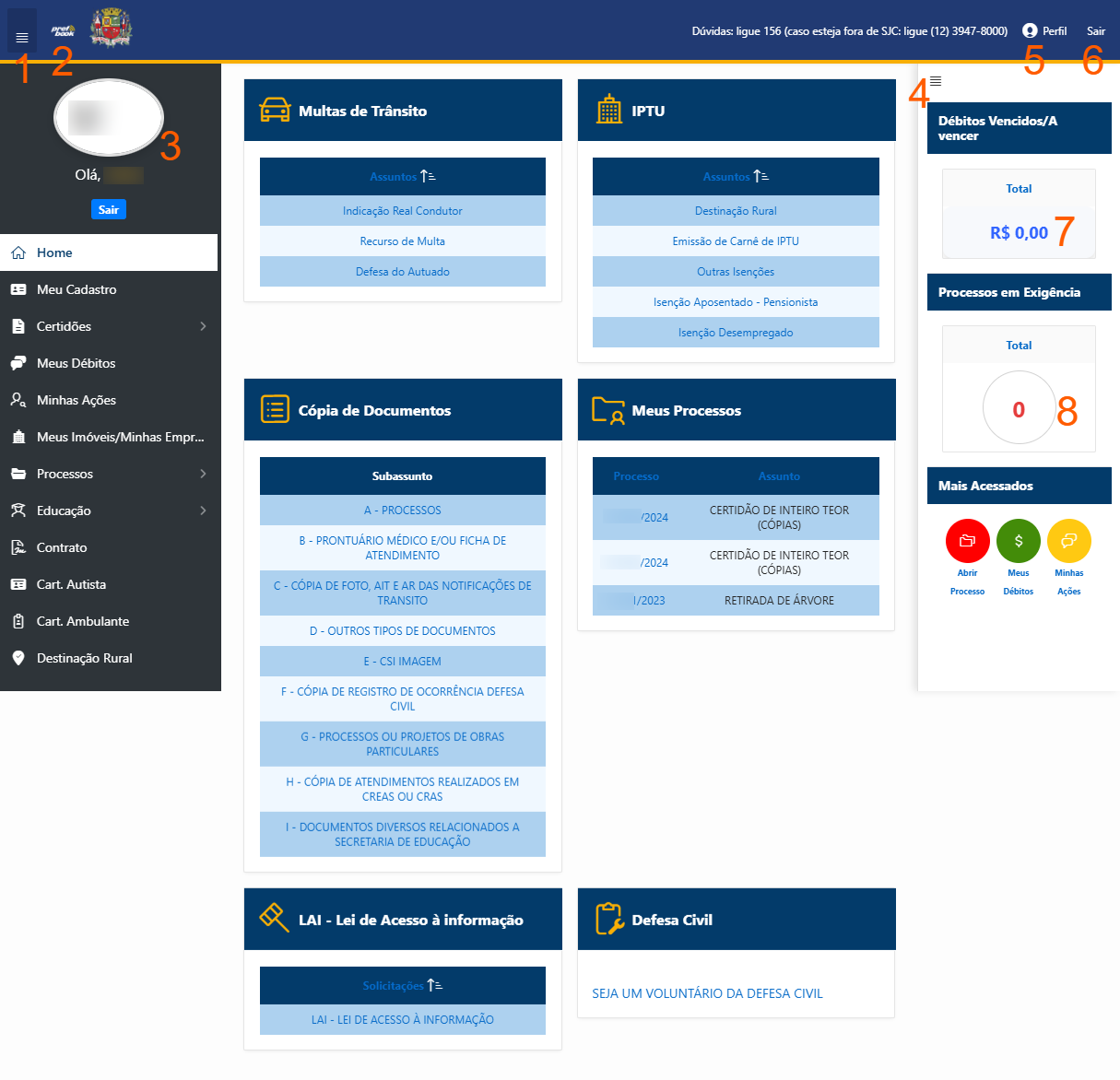 - Processos: abertura de novos processos, lista de processos existentes associados ao seu CPF (inclusive os abertos presencialmente), consulta do andamento, envio de documentos complementares (resolução de exigência)