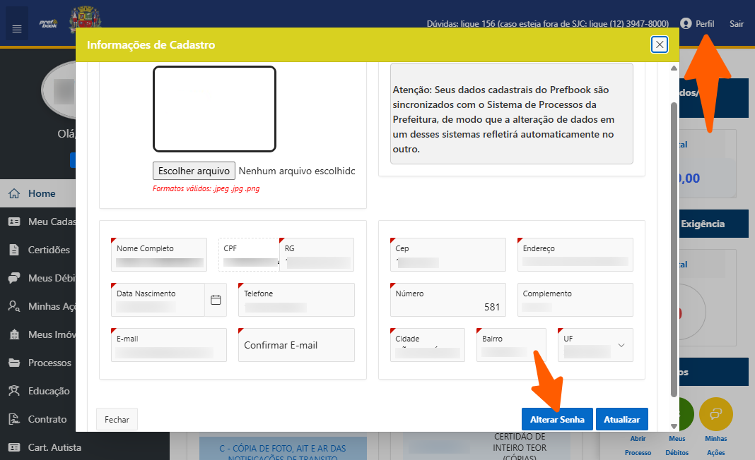 - Clique na palavra 'Perfil' (ou use a opção 'Meu Cadastro' do menu lateral) para visualizar os seus dados pessoais cadastrados na Prefeitura e, se desejar, enviar um arquivo com a sua foto e alterar a sua senha.